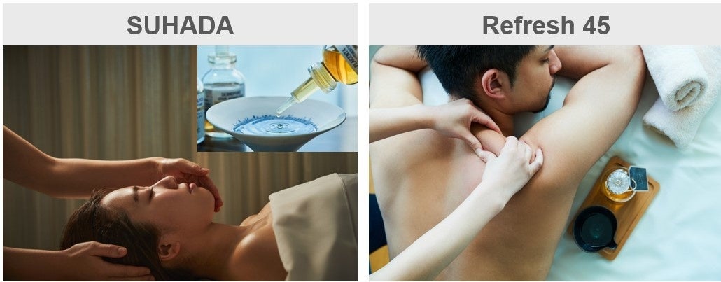 「SUHADA」は、近年のナチュラルメイク志向の高まりから、肌本来の美しさを取り戻し、素肌力を引き上げたいというニーズに応える1日3名限定のプレミアムなトリートメントです。トリートメント前後にはプールやフィットネスエリアの利用も可能な、約半日にわたる極上のホテルスパ体験を堪能いただける、自分へのご褒美にぴったりな内容です。お出かけ前や仕事の合間、仕事帰りなど時間がない時でも短時間で充実した施術が受けられる「Refresh 45」は、リモートワークや長時間のパソコン作業などで凝り固まった体の慢性的な疲れを集中的にケアし、心身ともにリフレッシュできるとともにスッキリとした顔印象へと導く、男女共におすすめの自分メンテナンスに最適なトリートメントです。
