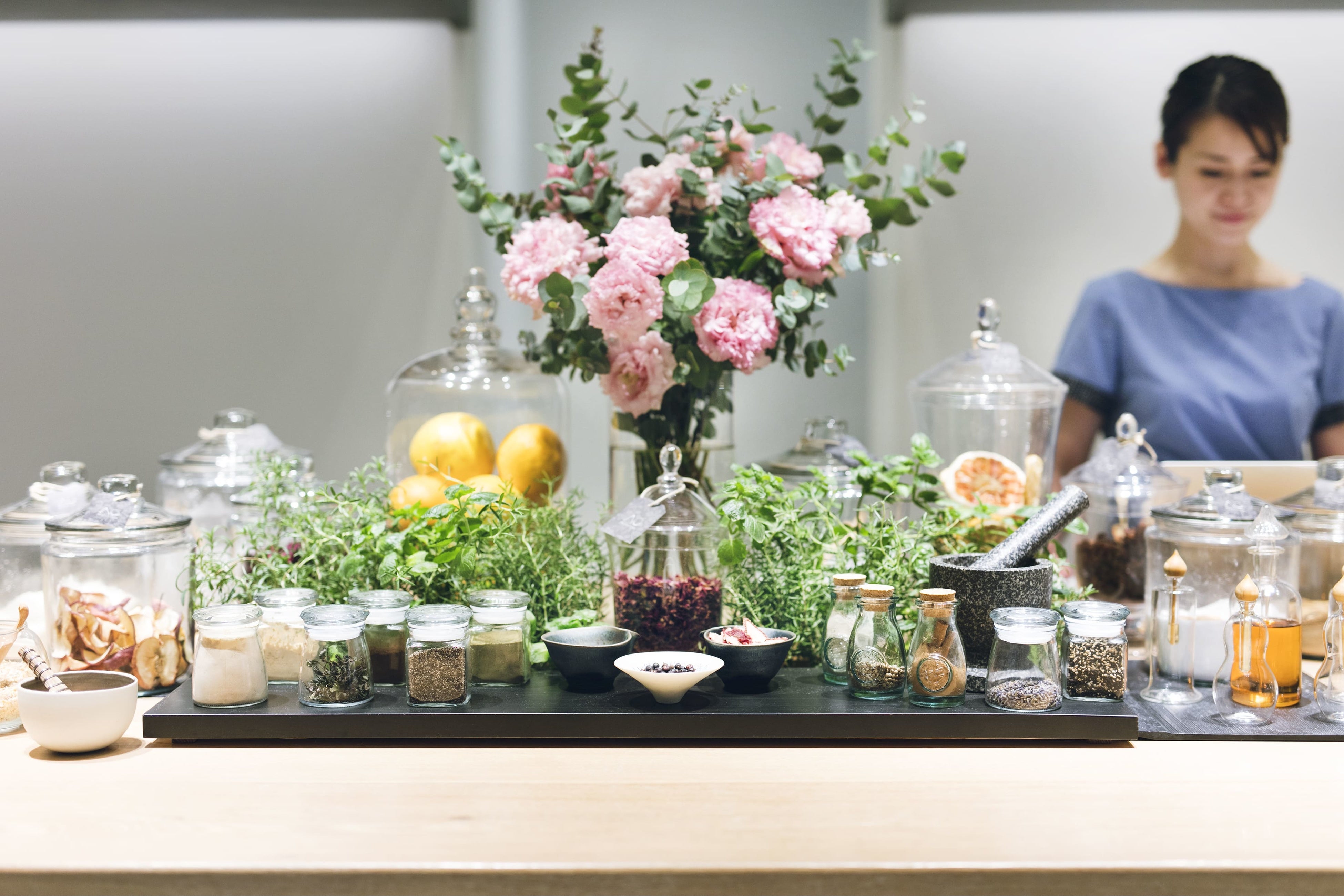 AO スパ独自のフレッシュハーブやフルーツを使用したブレンドバーで、一人ひとりのニーズに合わせパーソナライズしたスクラブを作成し、足元をケアします。