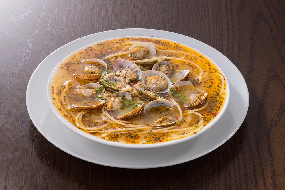 貝のエキスを抽出した出汁で旨味を効かせ、アサリとアクセントにジェノバソースが効いたスープスパゲッティ版ボンゴレビアンコ。