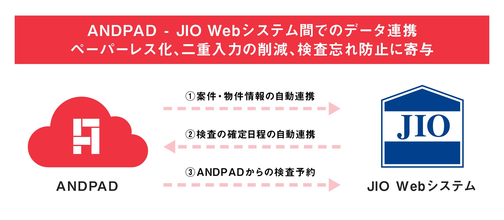 クラウド型建設プロジェクト管理サービス「ANDPAD」を運営する株式会社アンドパッド(本社:東京都千代田区、代表取締役:稲田武夫、以下アンドパッド)と住宅瑕疵保険を提供する株式会社日本住宅保証検査機構(本社:東京都千代田区、代表取締役:平井 雅彦、以下JIO)は、住宅業界の生産性向上を目的に、協業を開始いたしました。「ANDPAD」とJIOの提供する「JIO Webシステム」※1のシステム連携を行い、住宅瑕疵保険および検査に関わる業務効率化に寄与いたします。