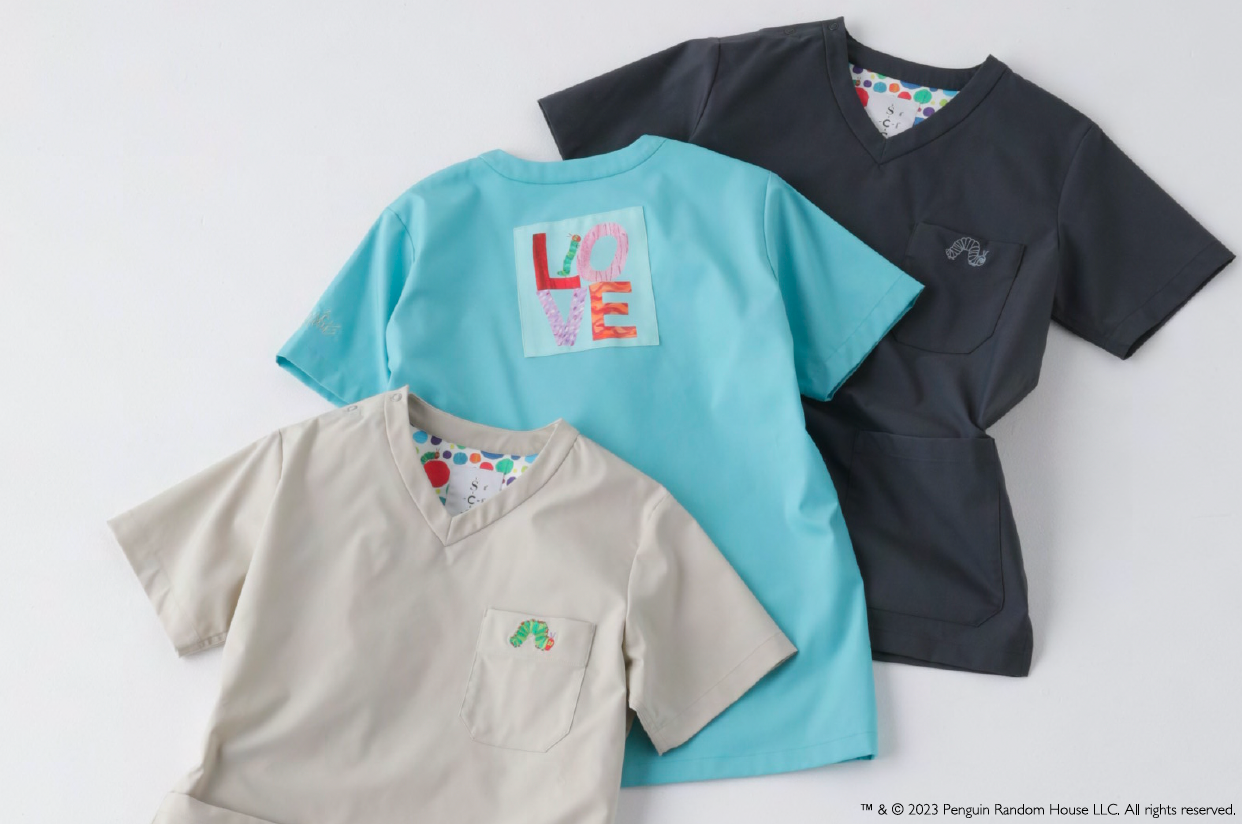 第9弾となる今回は、子どもから大人まで多くの人に愛され、ワクワクするような豊かな色彩が魅力的な「はらぺこあおむし」とのコラボレーションが実現しました。時に過酷な環境で働く医療従事者、つらい治療に臨んだり気分が落ち込んだりすることも多い患者の方々の気持ちが明るくなるきっかけになればと願い、本コラボレーションに至りました。絵本と同じように、1匹のちいさなあおむしがこのスクラブを通して、医療現場に色とりどりの