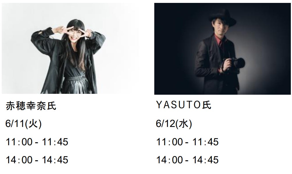 6月11日(火)は大阪の人気スタジオ「+wit(プラスウィット)赤穂 幸奈 氏」、6月12日(水)は名古屋市を中心に婚礼施設を6店舗展開している「ARTS photograph(アーツフォトグラフ)YASUTO 氏」によるセミナーを予定しています。