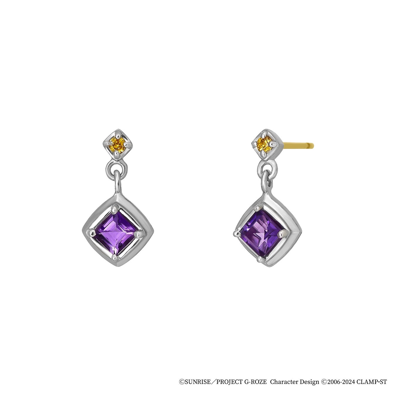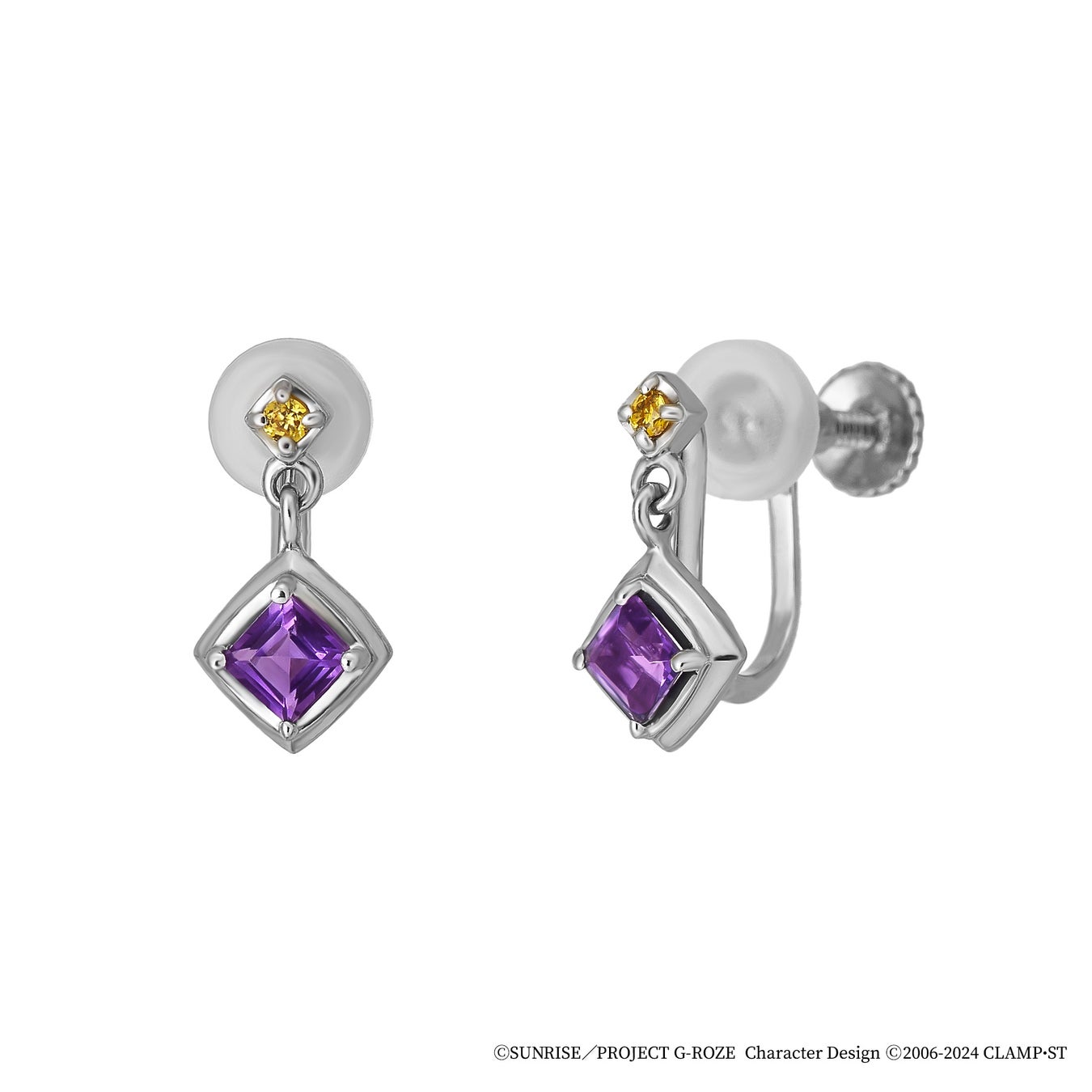 ロゼの髪色のキュービックジルコニアの下で揺れる、菱形のアメジストを留めた石座の裏にはギアスマークが浮かびます。首輪をモチーフにしたデザインは細部にまでこだわり、シャープながらも柔らかな印象になるようにこだわりました。