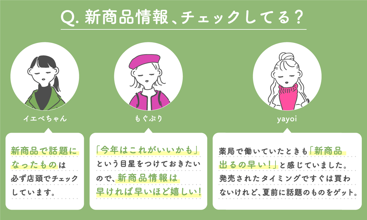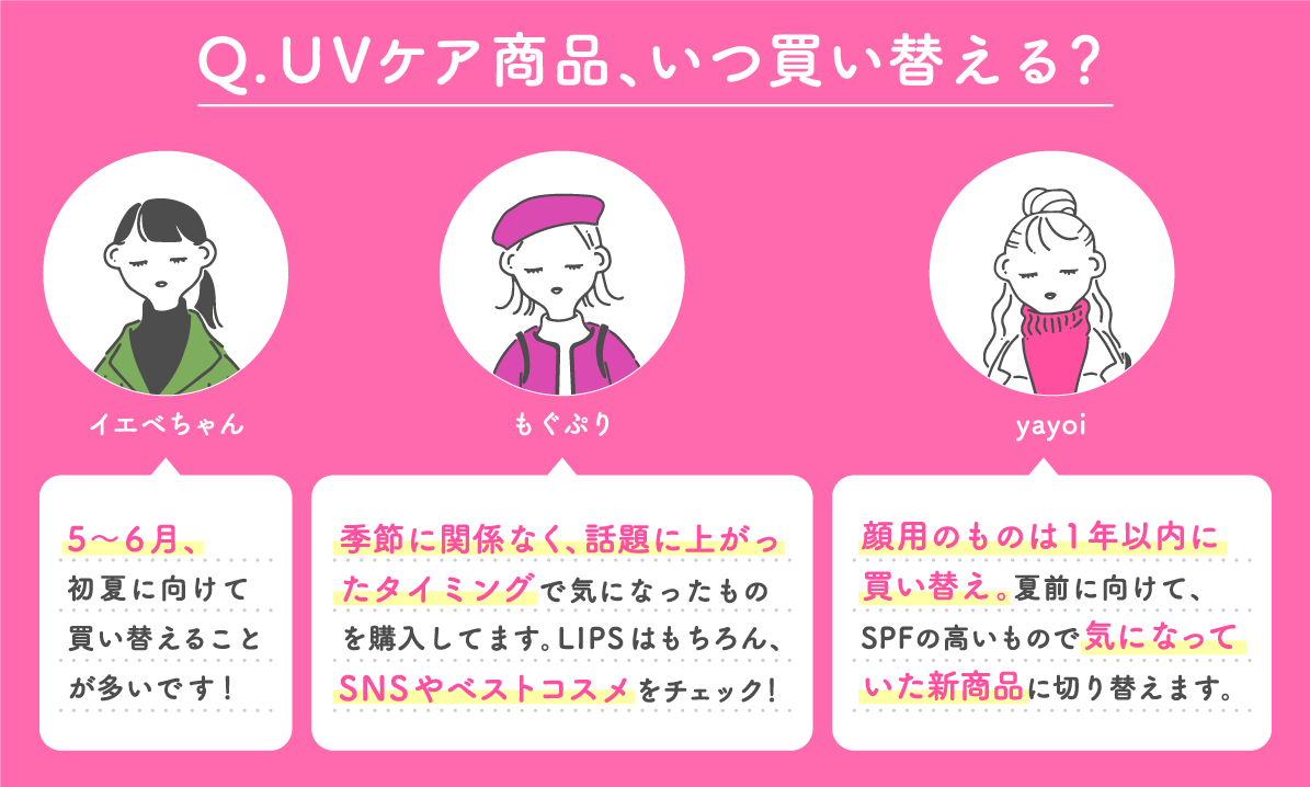 実際に、5・6月ぐらいにUVケアアイテムを買い換えるというイエベちゃんさんは「春先に出た新商品で、話題になったものは必ず店頭でチェックする」とのこと。チェックするタイミングと使い始めるタイミングにラグがあるよう。