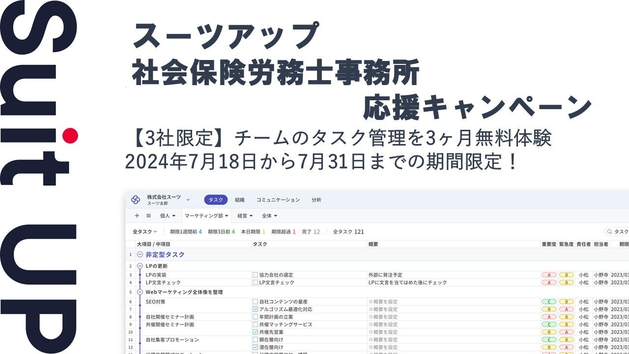 株式会社スーツ(所在地:東京都千代田区、代表取締役社長CEO:小松 裕介)は、チームでかんたん、毎日続けられるプロジェクト・タスク管理ツールの経営支援クラウド「Suit UP」(スーツアップ)において、社会保険労務士事務所応援キャンペーンを実施いたします。