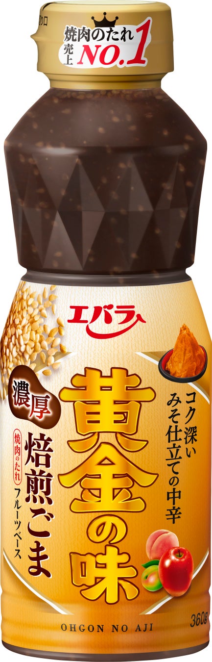 「黄金の味 濃厚焙煎ごま」は、原料の3分の1に国産リンゴを使用したフルーツベースの焼肉のたれという「黄金の味」の基本価値はそのままに、ゴマをたっぷり加えたみそ仕立ての焼肉のたれです。