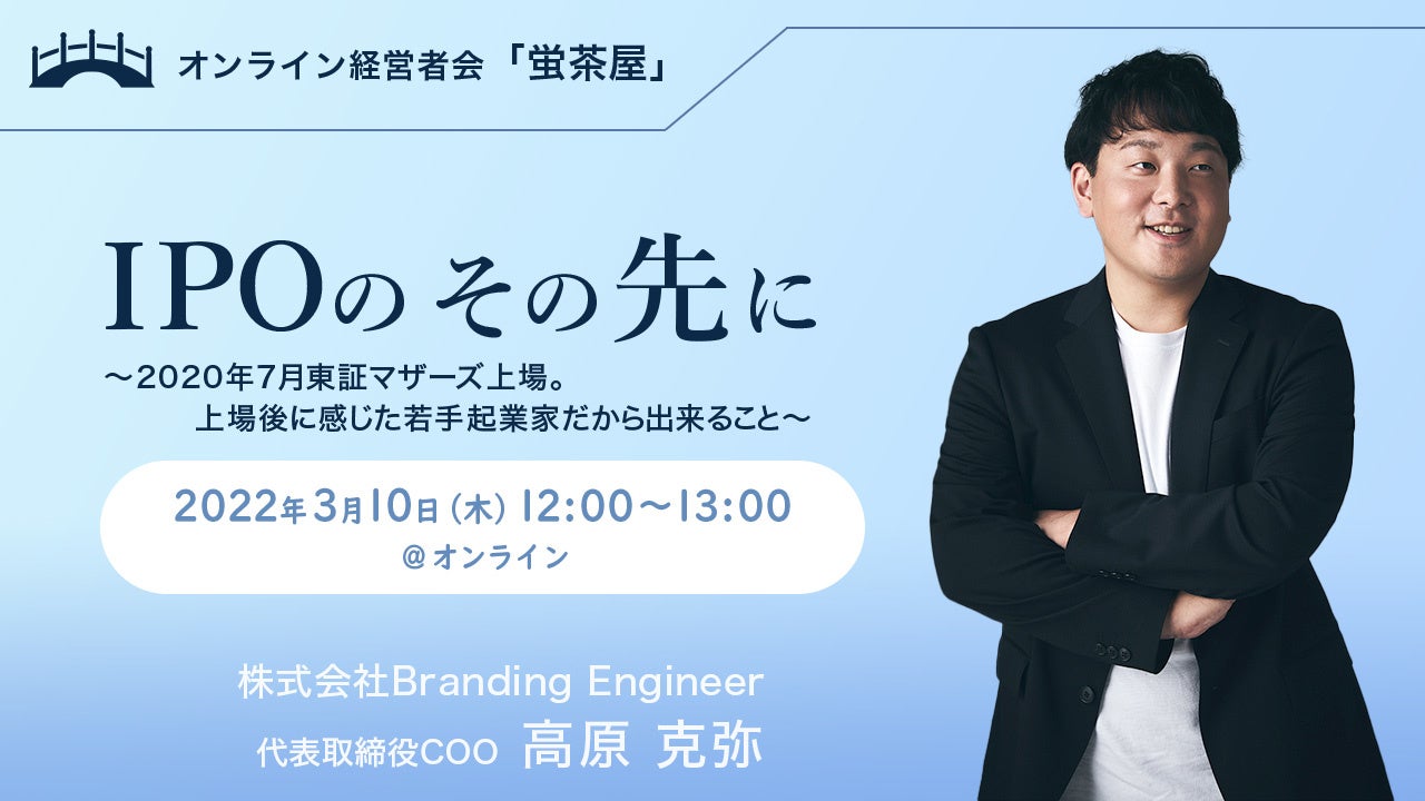 イシン株式会社では、オンラインでクローズドに開催する経営者限定の勉強会「蛍茶屋(ほたるぢゃや)」を毎週開催しています。今回は、「IPOのその先に ~2020年7月東証マザーズ上場。上場後に感じた若手起業家だから出来ること~」をテーマに、株式会社Branding Engineer 代表取締役COO 高原 克弥氏に登壇いただきます。