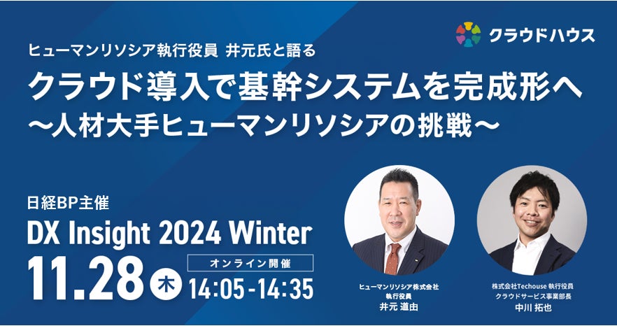 大企業向け人事労務DXクラウド『クラウドハウス労務』を運営する株式会社Techouse(本社所在地:東京都港区、代表取締役:礒邉基之、以下「Techouse」)は、日経BP主催の「DX Insight 2024 Winter」にて、総合人材サービス大手ヒューマンリソシア株式会社(本社所在地:東京都新宿区、代表取締役:高橋哲雄、以下「ヒューマンリソシア社」)執行役員 井元氏と、Techouse 執行役員 クラウドサービス事業部長 中川が公開対談を実施することをお知らせいたします。