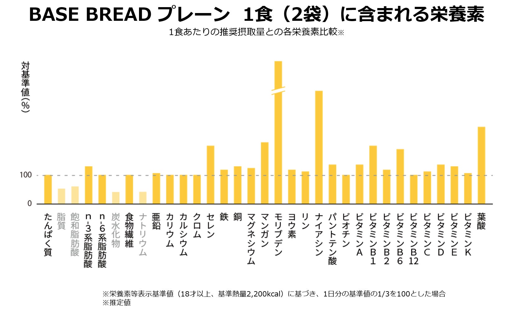 *1 主食(パン類、クッキー)において、1食(BASE BREADは2袋、BASE Cookiesは4袋)あたり*2を満たし、栄養成分表示に表記している商品(2022年5月Mintel社データベースを使用した当社調べ)