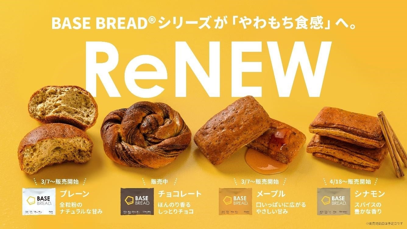 完全栄養パン「BASE BREAD」シリーズ、 プレーン・メープル・シナモン 3種のフレーバーが「やわもち食感」へ!2023年3月7日より順次リニューアル販売開始!