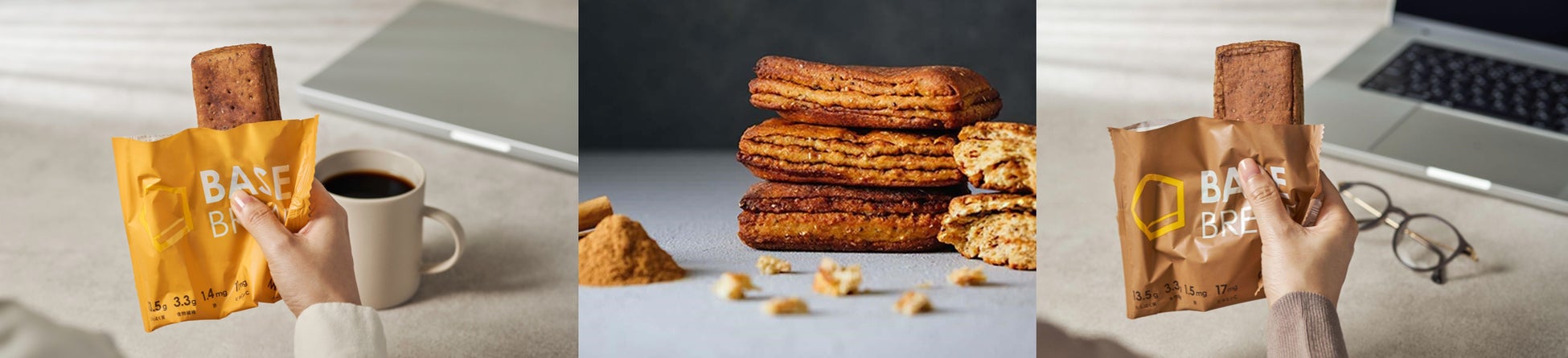 昨年11月には、たんぱく質や食物繊維など素材のもつ栄養素の構造に着目することで「BASE BREAD チョコレート」の食感を大幅アップデートしています。今回も生地の配合を改良したことで、パサつきや硬さが改良され”やわもち”食感に。また各フレーバー共に苦味が押さえられ、風味がより豊かに感じられる商品となりました。