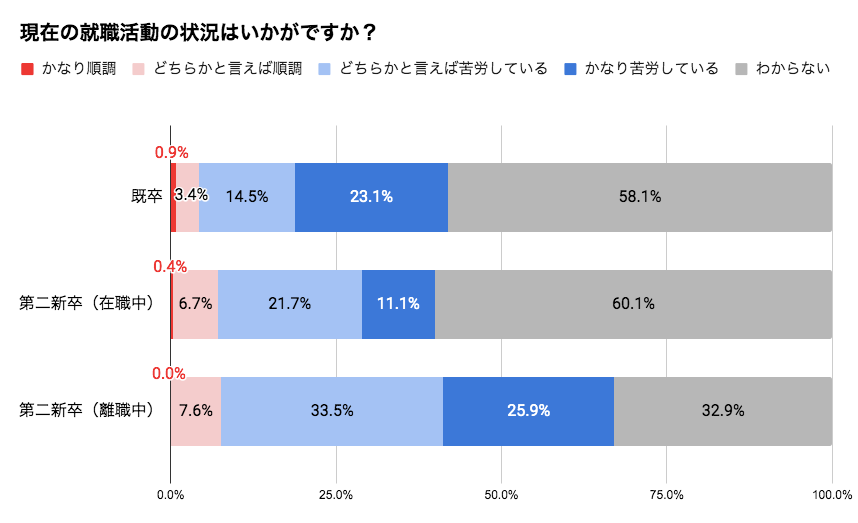 ・どちらかと言えば苦労している(既卒 14.5%、第二新卒/在職中 21.7%、第二新卒/離職中 33.5%)