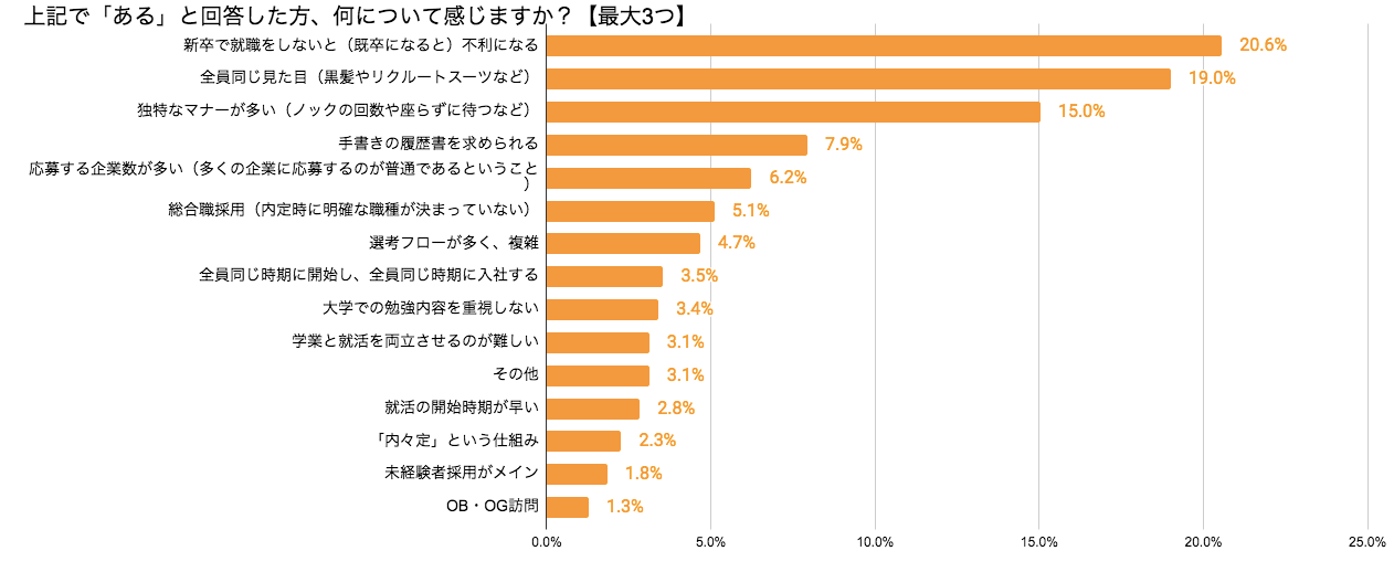 - 就活中のZ世代の2人に1人が、就職・転職活動において「おかしい」と感じることがあると回答。最多理由は「新卒で就活しないと不利になる」が約20%。僅差で「全員同じ見た目」「独特なマナーが多い」の回答が続く。