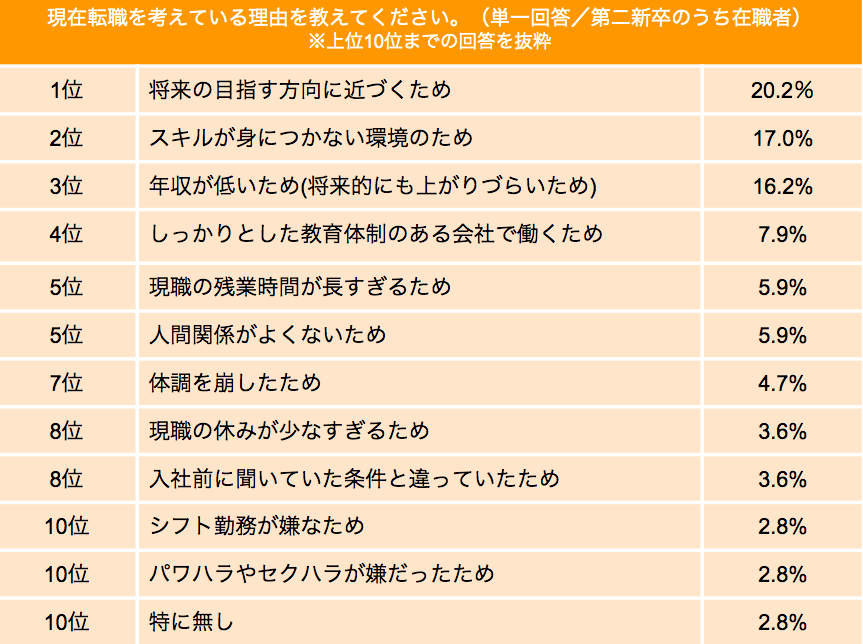 - 第二新卒のうち在職者が現在転職を考えている理由として、5人に1人が「将来の目指す方向に近づくため」と回答。「スキルが身につかない」「年収が低い」が続く。
