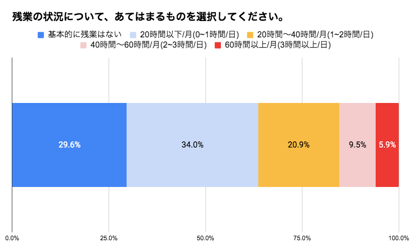 - 第二新卒の半数以上が、現在の残業時間を「20時間以下」と回答。
