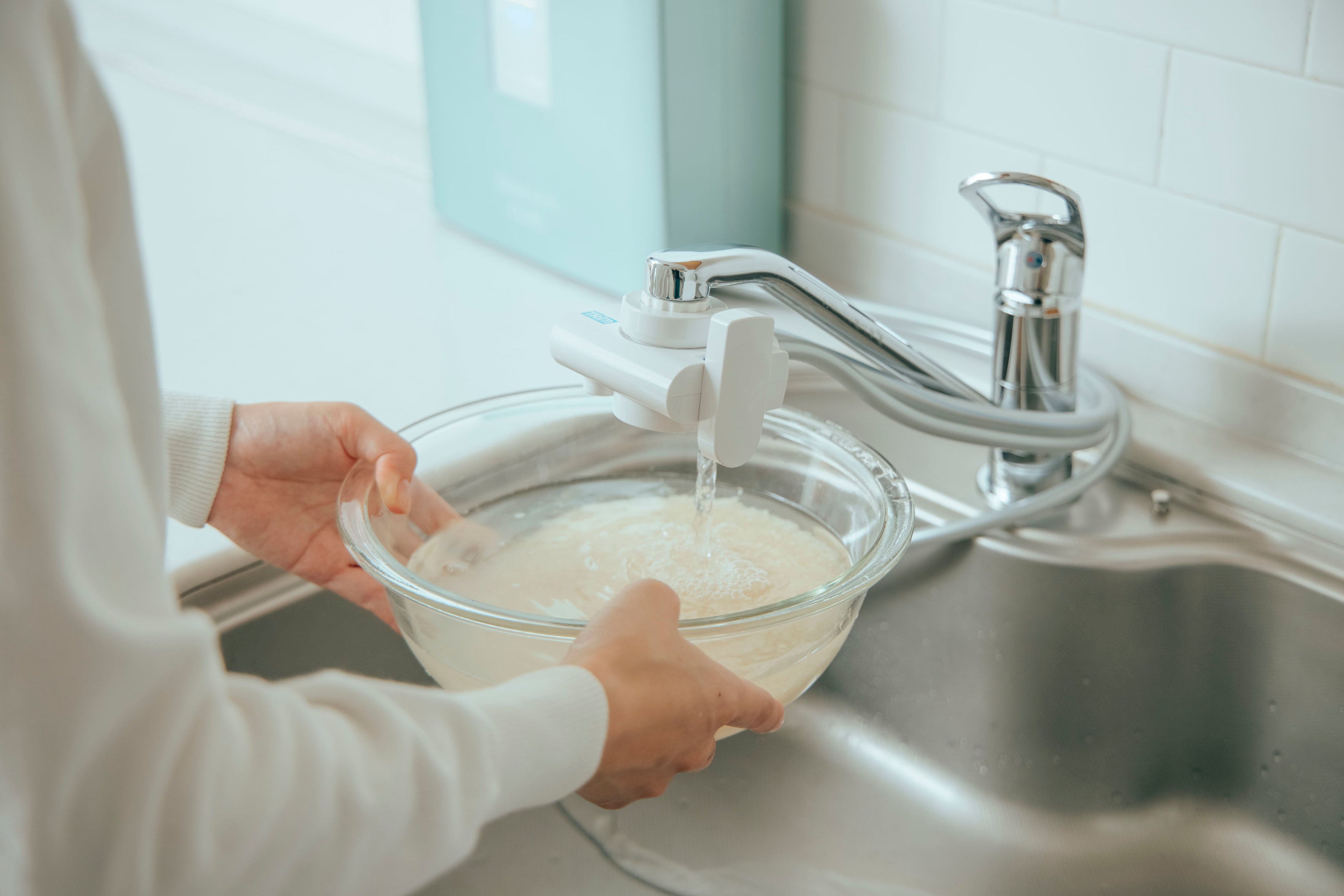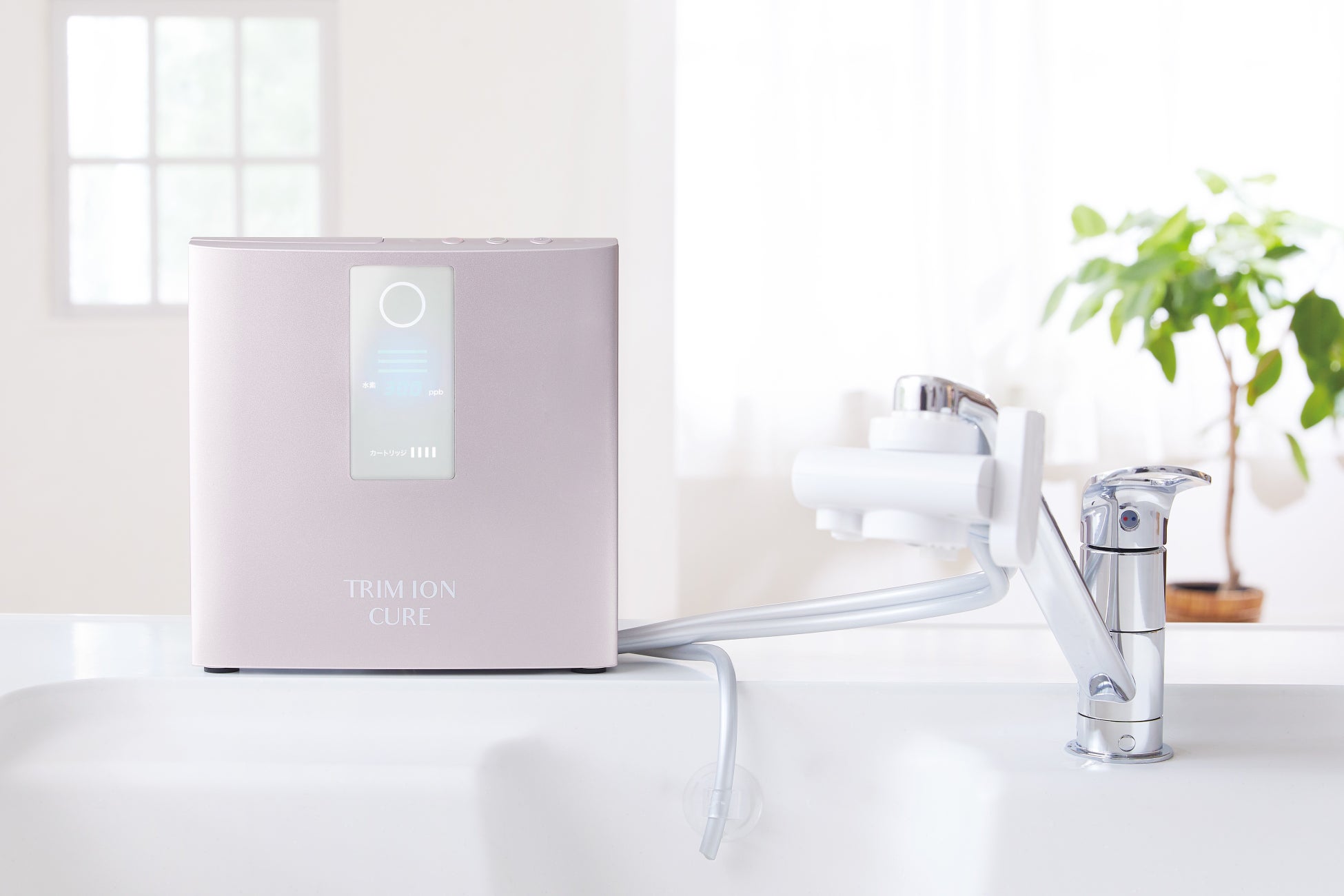 日本トリムの整水器は家庭の蛇口に部品を取り付け、蛇口をひねるだけで、いつでもできたての水素水が出てくる手軽さがメリットの一つです。電解水素水のほかに、浄水、酸性水といった3種類の水をつくることができ、pH4(酸性)〜10(アルカリ性)前後の水を作ることができます。