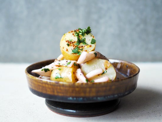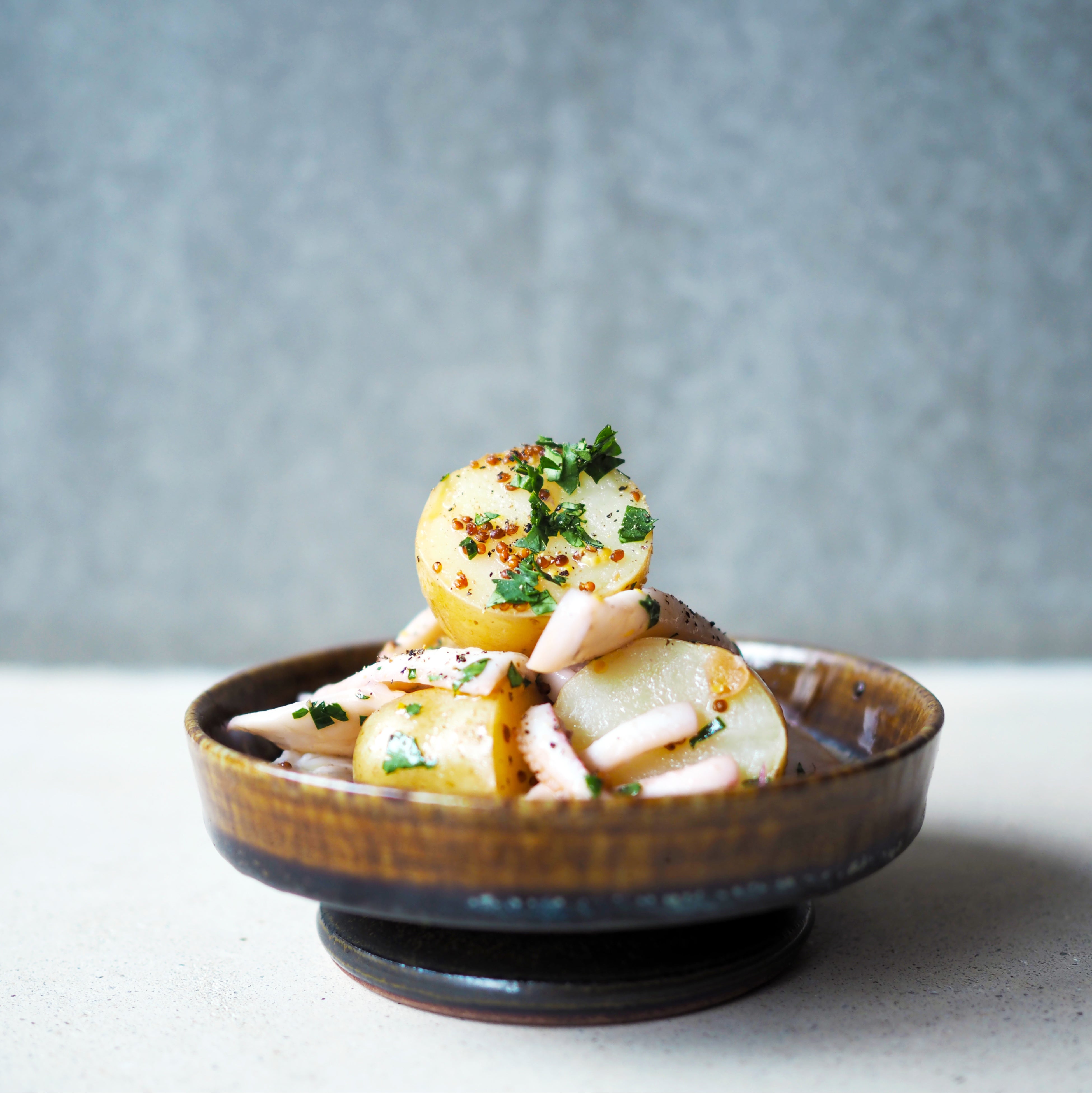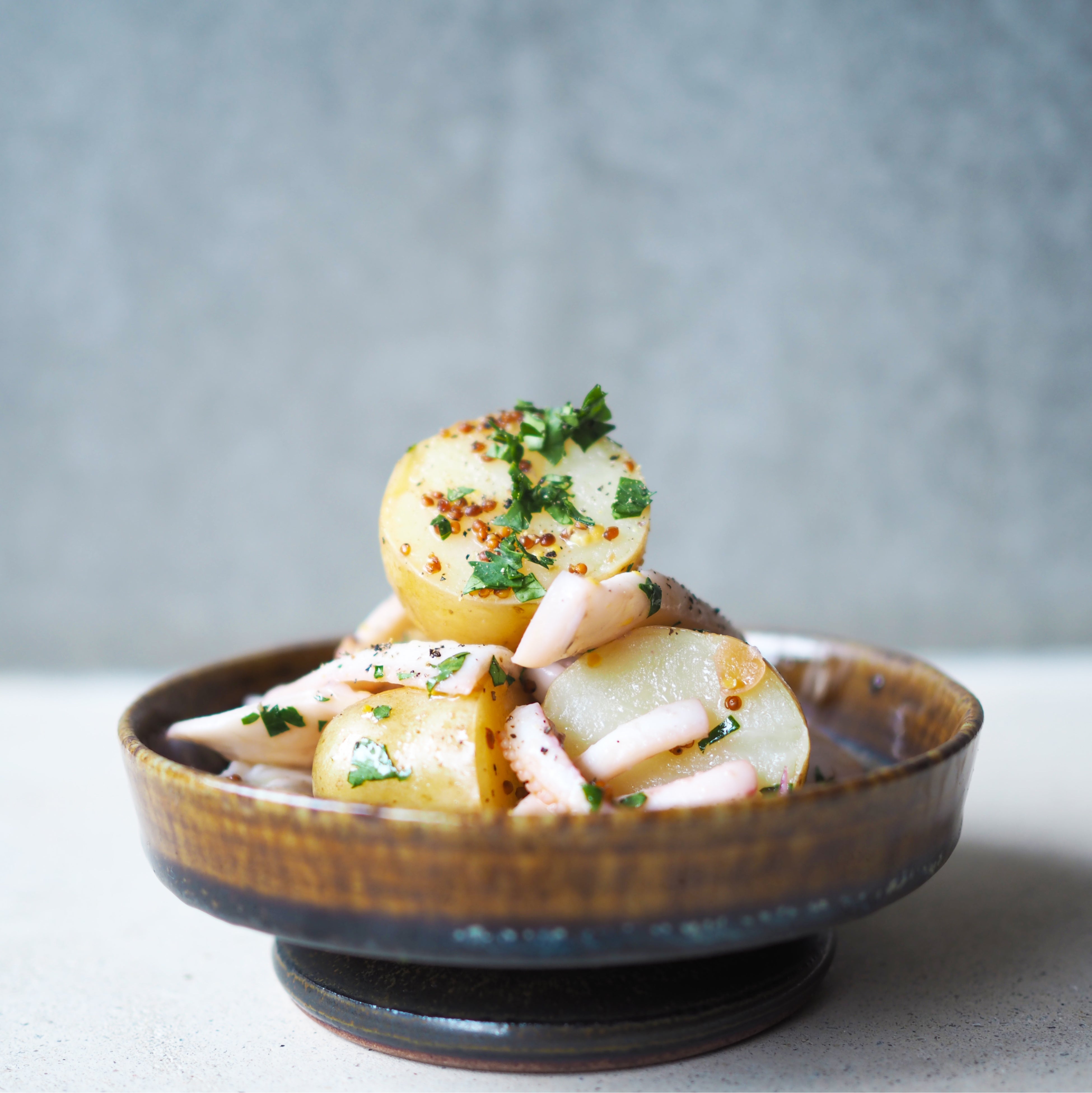 ③のフライパンに茹でた新じゃがを加えてソースと馴染ませる。仕上げにみじん切りにしたパクチーを加えて完成。パクチーが苦手な方はセロリの葉っぱや、パセリに変えても◎