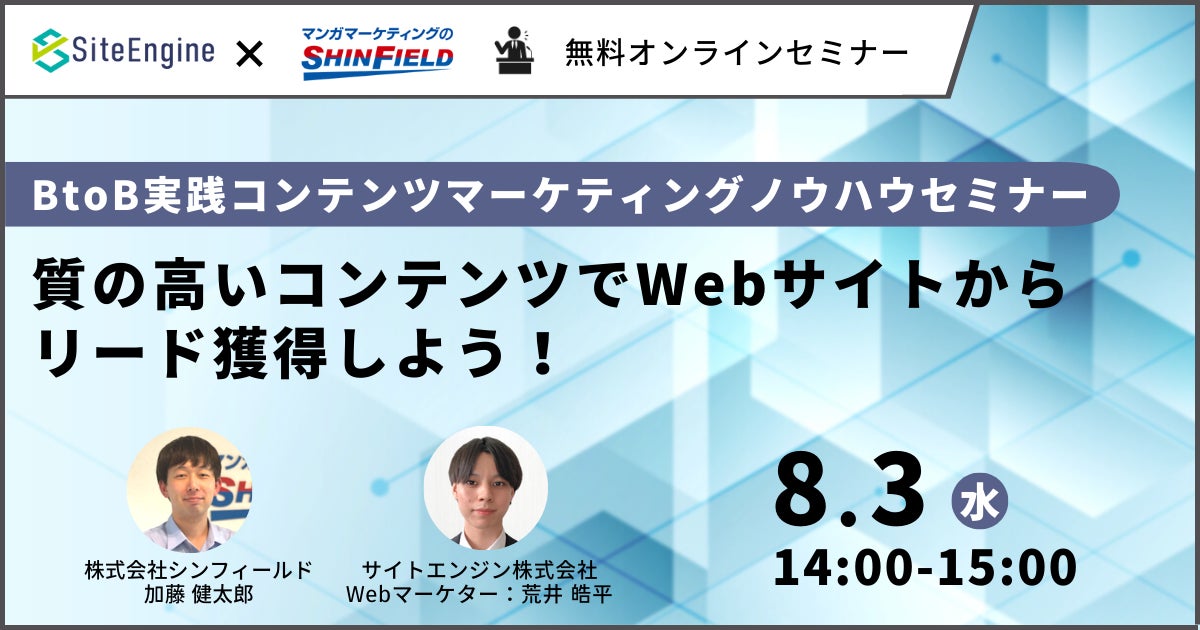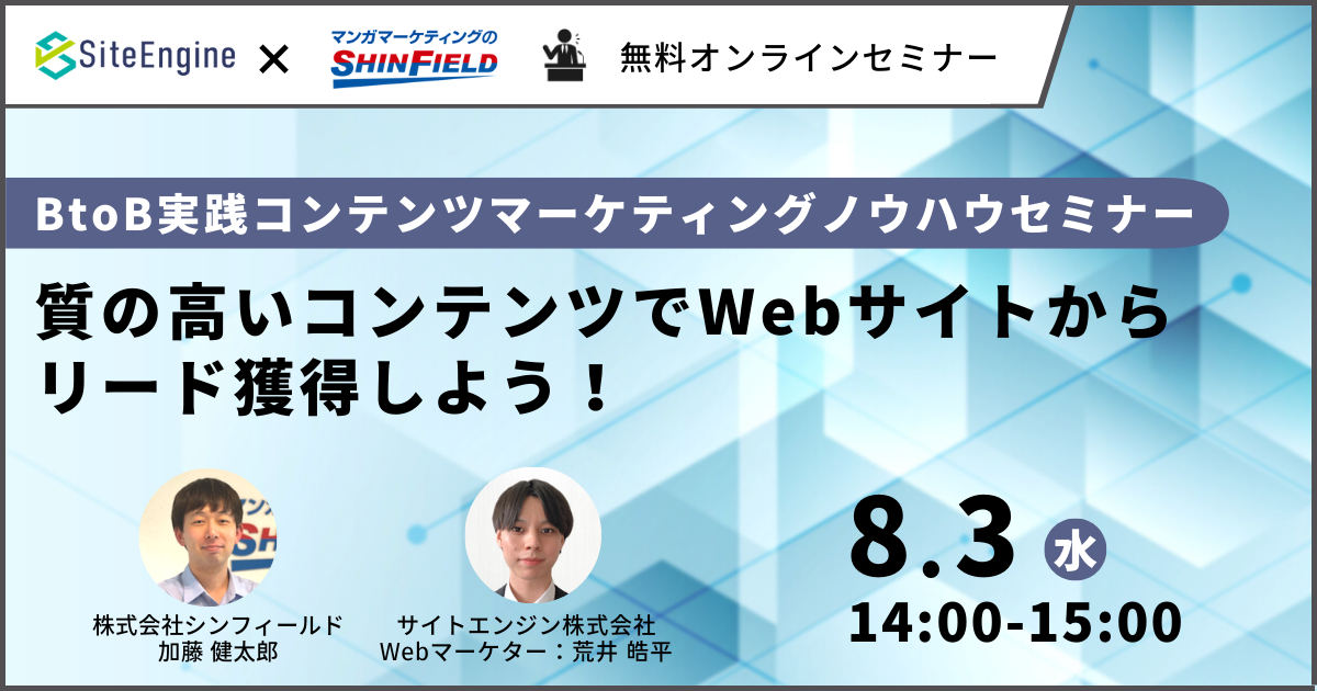 「自己表現にテクノロジーとアイデアを」を経営理念としてWebマーケティング支援サービスを提供するサイトエンジン株式会社(本社:東京都世田谷区 代表取締役:毛塚 智彦)は、2022年8月3日(水)14:00~15:00に、株式会社シンフィールド(本社:東京都千代田区 代表取締役:谷口 晋也)との” 質の高いコンテンツでWebサイトからリード獲得しよう! BtoB実践コンテンツマーケティングノウハウセミナー” を開催します。