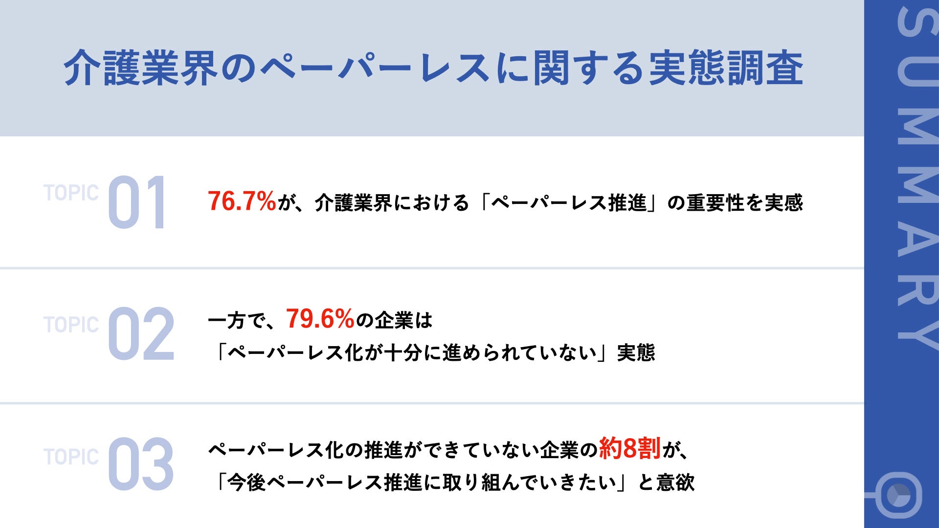 - 76.7%が、介護業界における「ペーパーレス推進」の重要性を実感