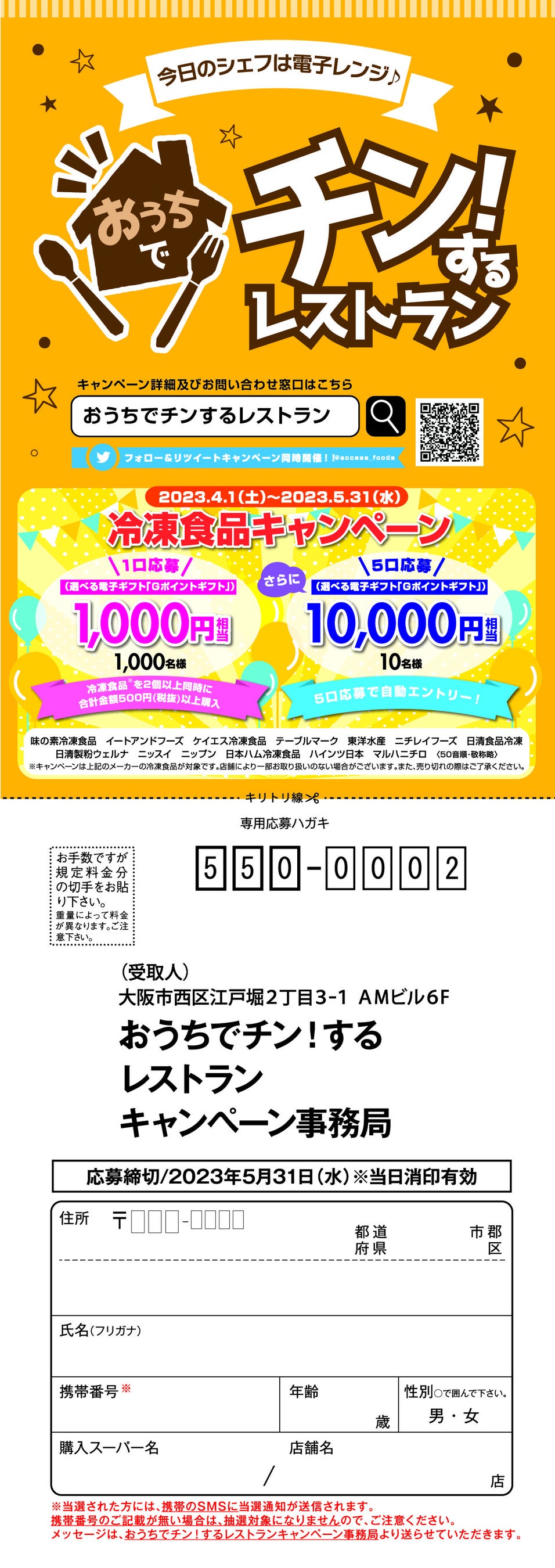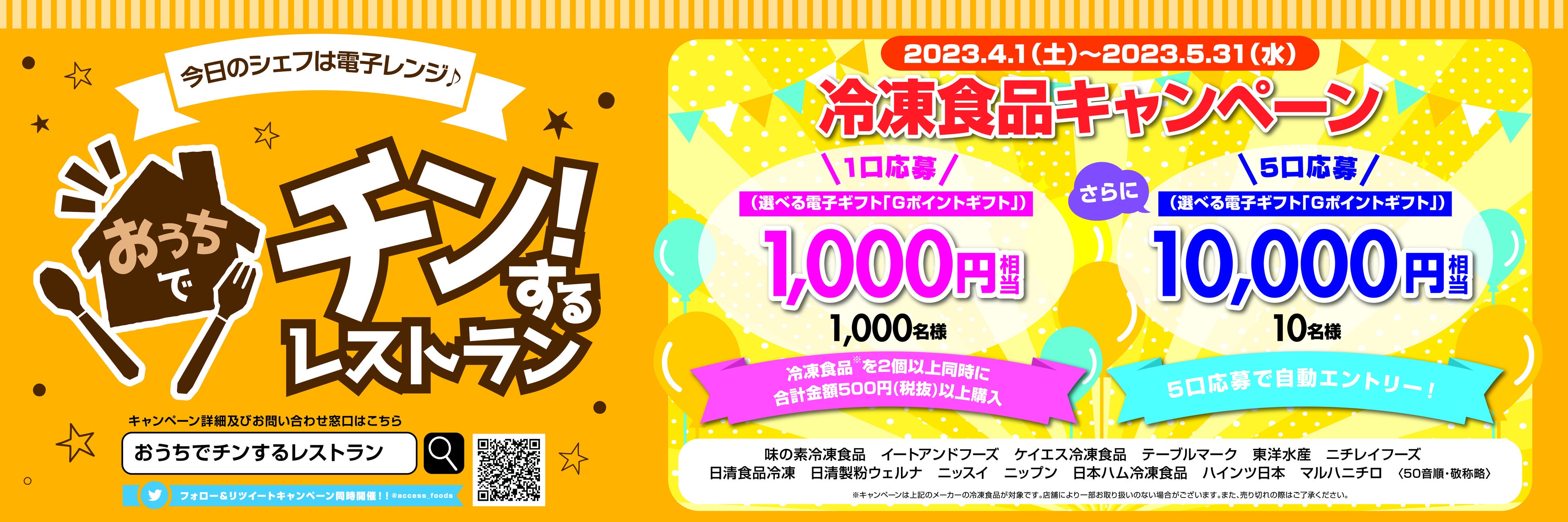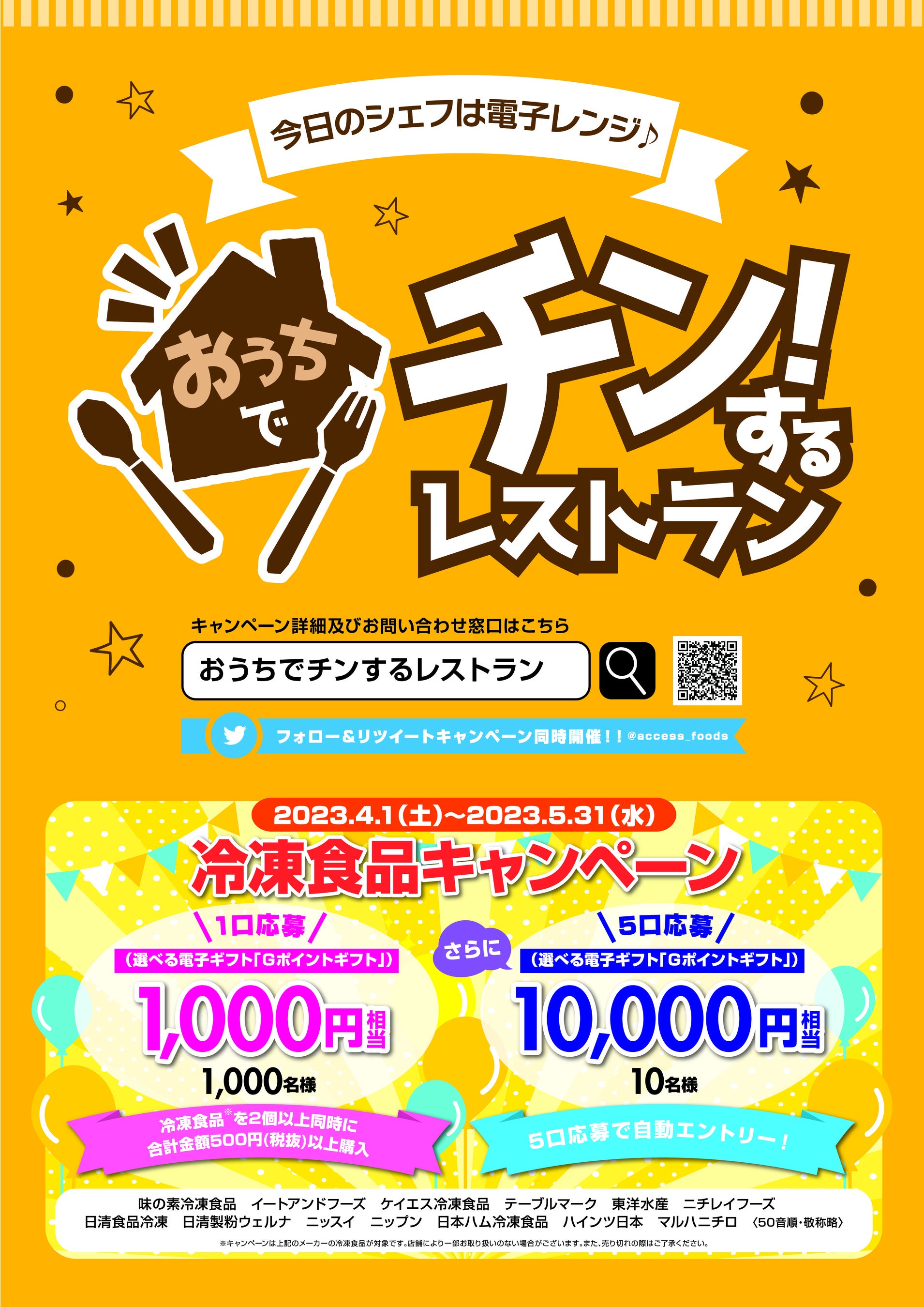 株式会社日本アクセス(所在地:東京都品川区、代表取締役社長:佐々木淳一)は、2023年4月1日より5月31日までの2か月間、冷凍食品販促企画『おうちでチン!するレストラン』を実施いたします。
