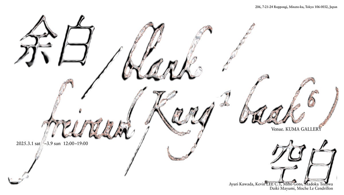 この度、クマ財団が支援するクリエイター奨学金8期生・45名による成果発表を目的としたグループ展シリーズ「KUMA experiment 2024-25」の第7弾として、展覧会『余白/blank/freiraum/空白(Kung¹ baak⁶)』をクマ財団ギャラリー(六本木)にて2025年3月1日(土)〜3月9日(日)に開催いたします。