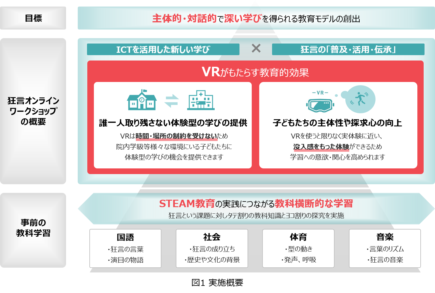 そこで今回、文化庁の「子供のための文化芸術鑑賞・体験再興事業※1」として、2023年2月に各者の取り組みの融合と更なる発展に向けて、狂言の学校巡回公演をオンラインかつVRを用いた新たな授業形態で実施します。本取り組みを通じて予測困難な社会の変化に向き合い、子どもたちが未来を切り拓くための「生きる力※2」を育成し、新しい価値を生み出せる教育モデルの創出に挑戦します。