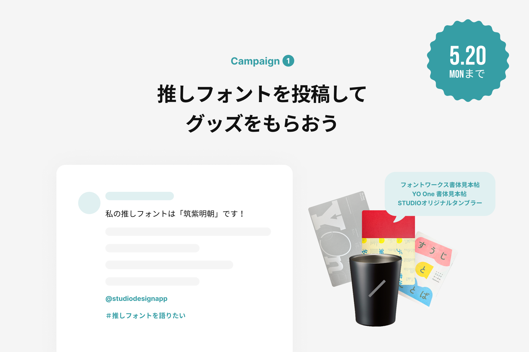 好きな書体やこだわりを「#推しフォントを語りたい」とサイトURLをつけてXに投稿頂いた方の中から抽選で10名様にSTUDIOとフォントワークスのグッズをプレゼントいたします。