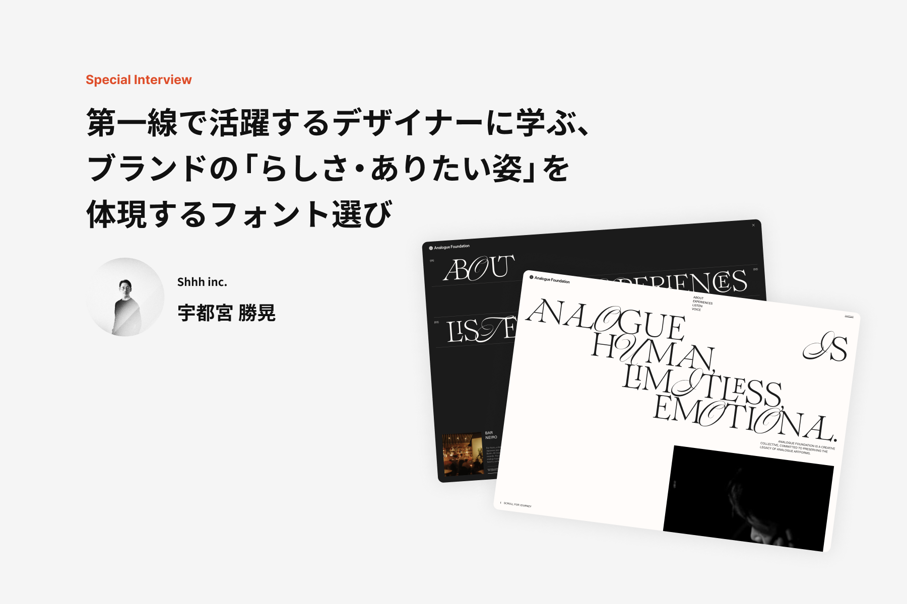 株式会社Shhh 取締役 宇都宮 勝晃さんの特別インタビュー記事を掲載。Webデザインにおいて、効果的な書体の選び方や使い方などについて教えていただきました。