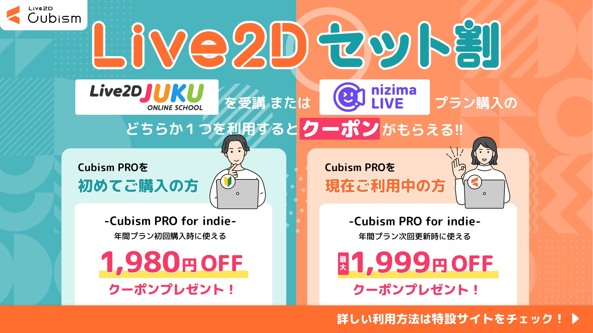 Live2D社が提供するオンライン講座「Live2D JUKU」、フェイストラッキングアプリ「nizima LIVE」のどちらかにご加入いただくと、Live2D Cubism PRO for indie 年間プランの新規購入または契約更新料割引クーポンが使用できます!
