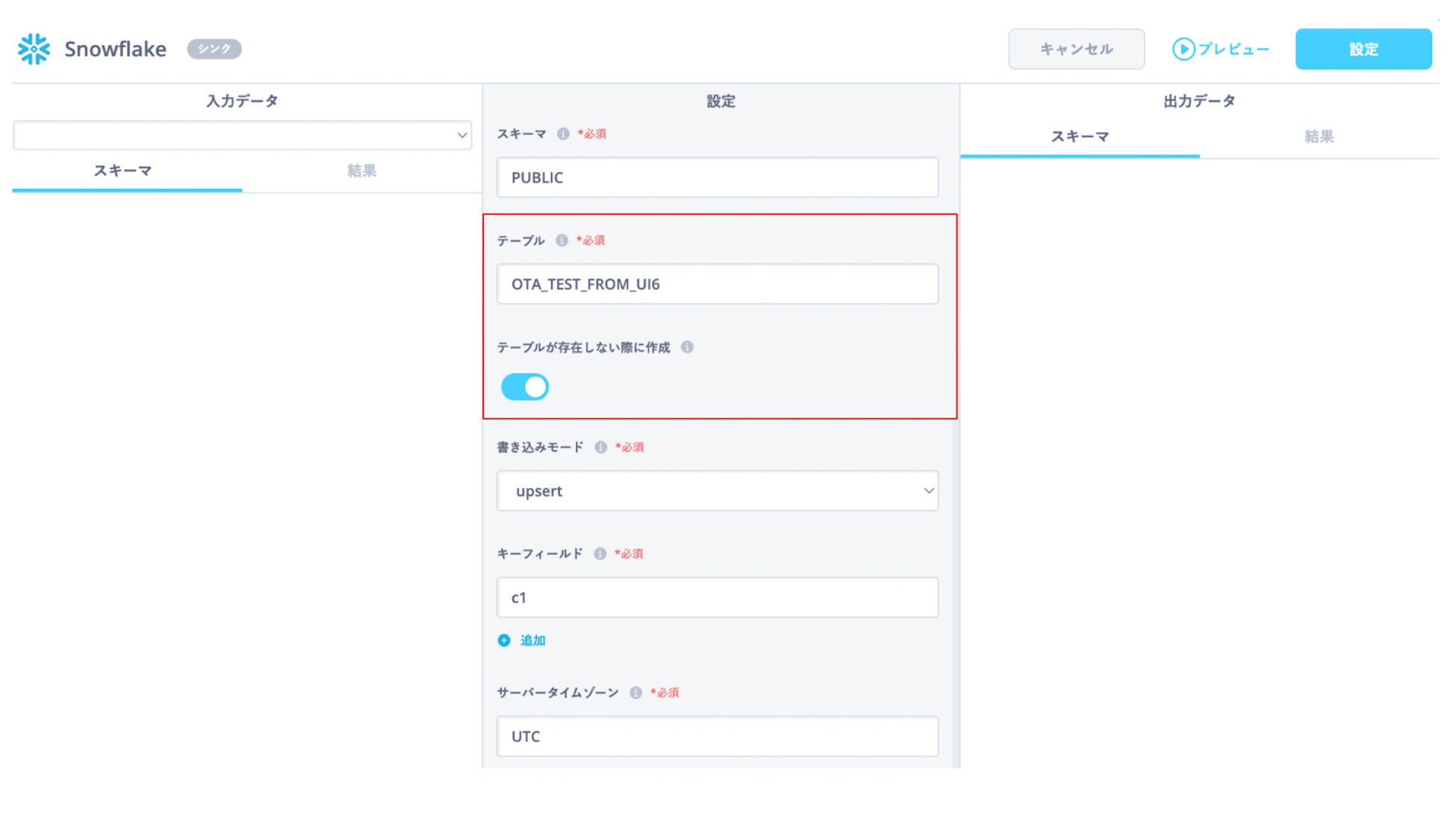 データ転送先 Snowflakeに、テーブル作成オプションを追加しました。これにより、ReckonerからSnowflakeにデータ転送する際に、テーブルがない場合でもReckoner側から自動でテーブル生成が可能になります。