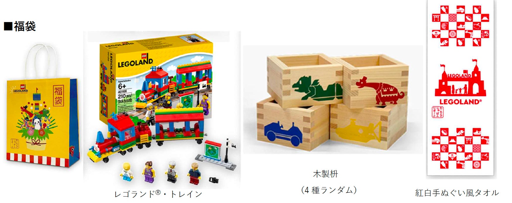 レゴランドⓇ ・ジャパン・リゾートでしか手に入らない限定オリジナル福袋が登場。レゴランドⓇの限定のボックスセット「レゴランドⓇ トレイン」(1個)や、他では手に入らない非売品の「木製枡※4種ランダム」(1個)、紅白手ぬぐい風タオル(34 ㎝×90 ㎝)」(1枚)、「パーク内レストラン500円利用券」(1枚)が入っています。