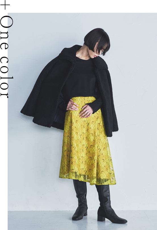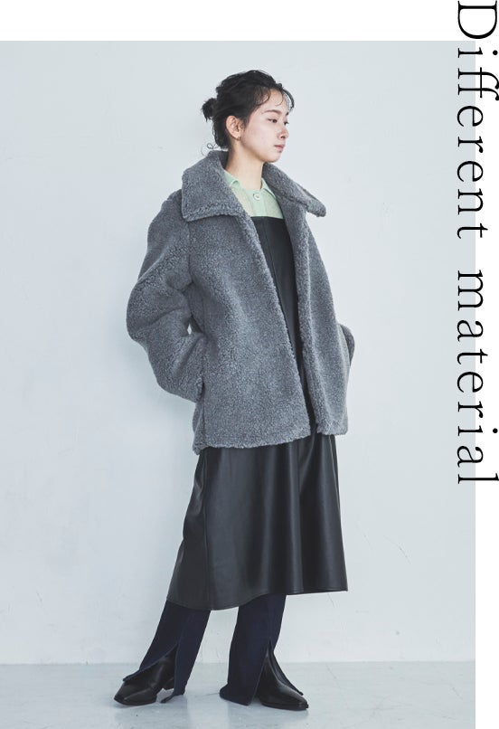 ベーシックカラーのコートには、一目でハッとするような質感の異なるアイテムをplusして。