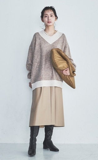 デコルテを見せたり、顔周りがすっきり見えるVネックを取り入れると華やかで洗練された印象に。カットに拘ったオールインワンは上品でヘルシーな雰囲気。ボアコートは前を閉じても着られるので、寒さ対策も安心です。