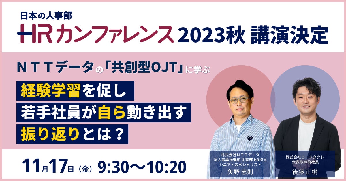 HRアワード2023で企業人事部門 優秀賞を受賞したNTTデータの「共創型OJT」による新入社員育成施策。施策設計のポイントを、NTTデータ担当者とともに、11月17日(金)の講演でお伝えします。