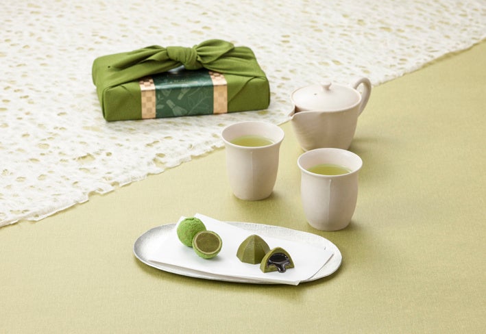 2種類の宇治抹茶ボンボンショコラを木箱に入れ、風呂敷で装い、風味豊かな石臼挽き宇治抹茶の緑鮮やかさを表現しました。