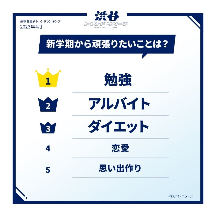 「勉強」が1位を獲得。前学年での成績を反省し、心機一転したいという声が散見されたほか、受験を控える新3年生からは、志望校を目指して頑張りたいという意気込みが寄せられました。また、5位には「思い出作り」がランクイン。新型コロナウイルスの感染対策が緩和され、体育祭や修学旅行等の学校行事が開催されるようになったことから、学生ならではのイベントを大切にし、思い出を作りたいと考える高校生が多くいました。