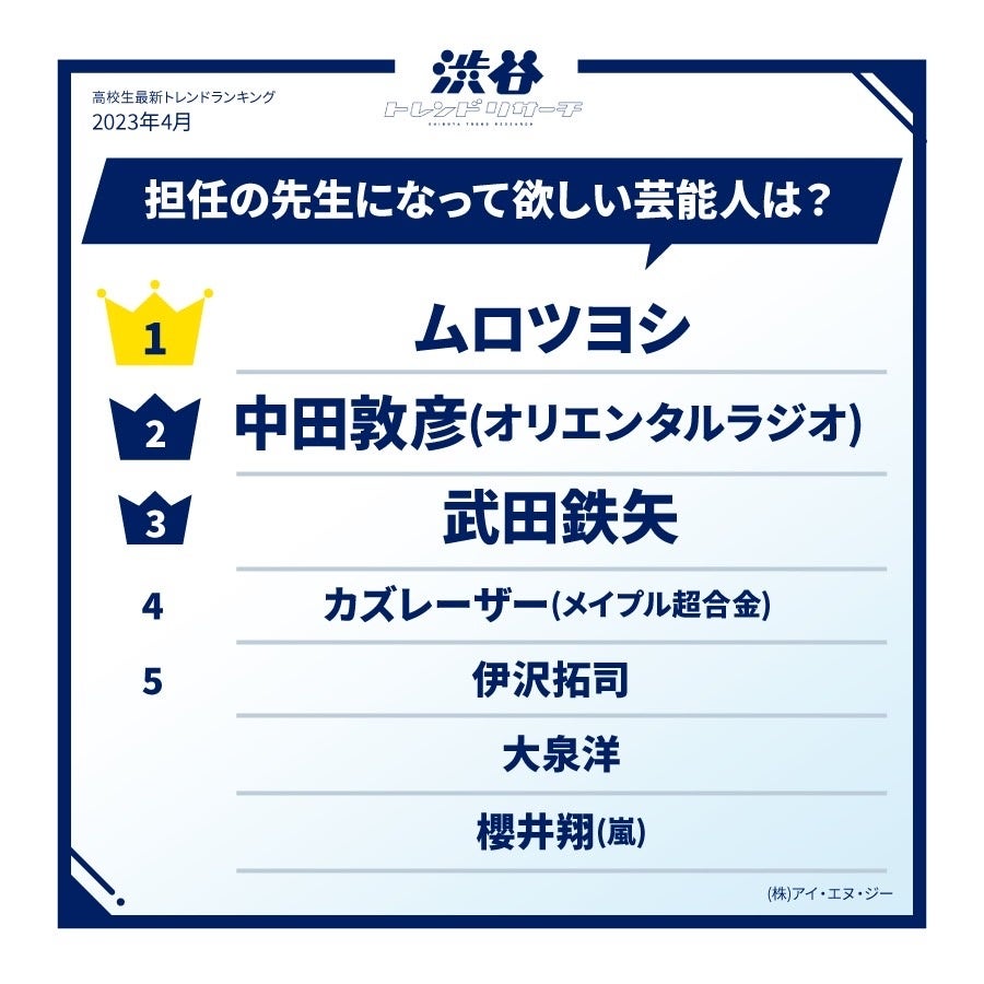 「ムロツヨシ」さんが1位を獲得。ドラマ『今日から俺は!!』での、椋木役が金八先生のようなビジュアルとコミカルな演技で話題となり、印象的だったようです。2位には「中田敦彦(オリエンタルラジオ)」さんがランクイン。登録者数500万人を超えるYouTubeチャンネル『中田敦彦のYouTube大学 - NAKATA UNIVERSITY』に投稿されている講義形式の動画が支持されています。ランキング上位には、先生役を演じた経験のある俳優のほか、クイズ番組で活躍しているタレントが並ぶ結果となりました。