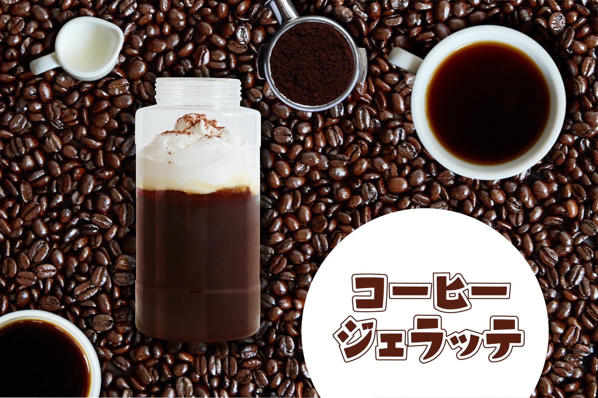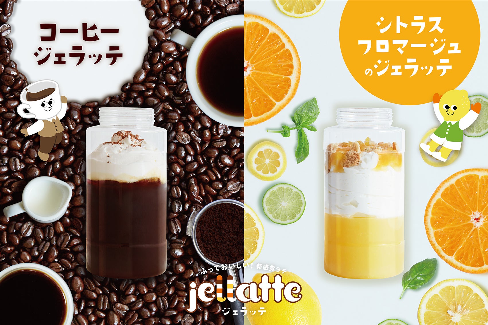 「jellatte(ジェラッテ)」は、コーヒーやフルーツ、ゼリー、ミルクなどが層になった状態から、振って混ぜながら楽しむ新感覚のスイーツドリンクです。振る回数や強弱の加減で、ゼリーの粒の大きさや素材の混ざり具合を調整し、お好みの食感に仕上げる事ができます。「jellatte(ジェラッテ)」という名称は、jelly(ゼリー)とlatte(ラテ)を掛け合わせた造語で、また「ジェラシーを感じるほど美味しい」というユーモアが込められています。