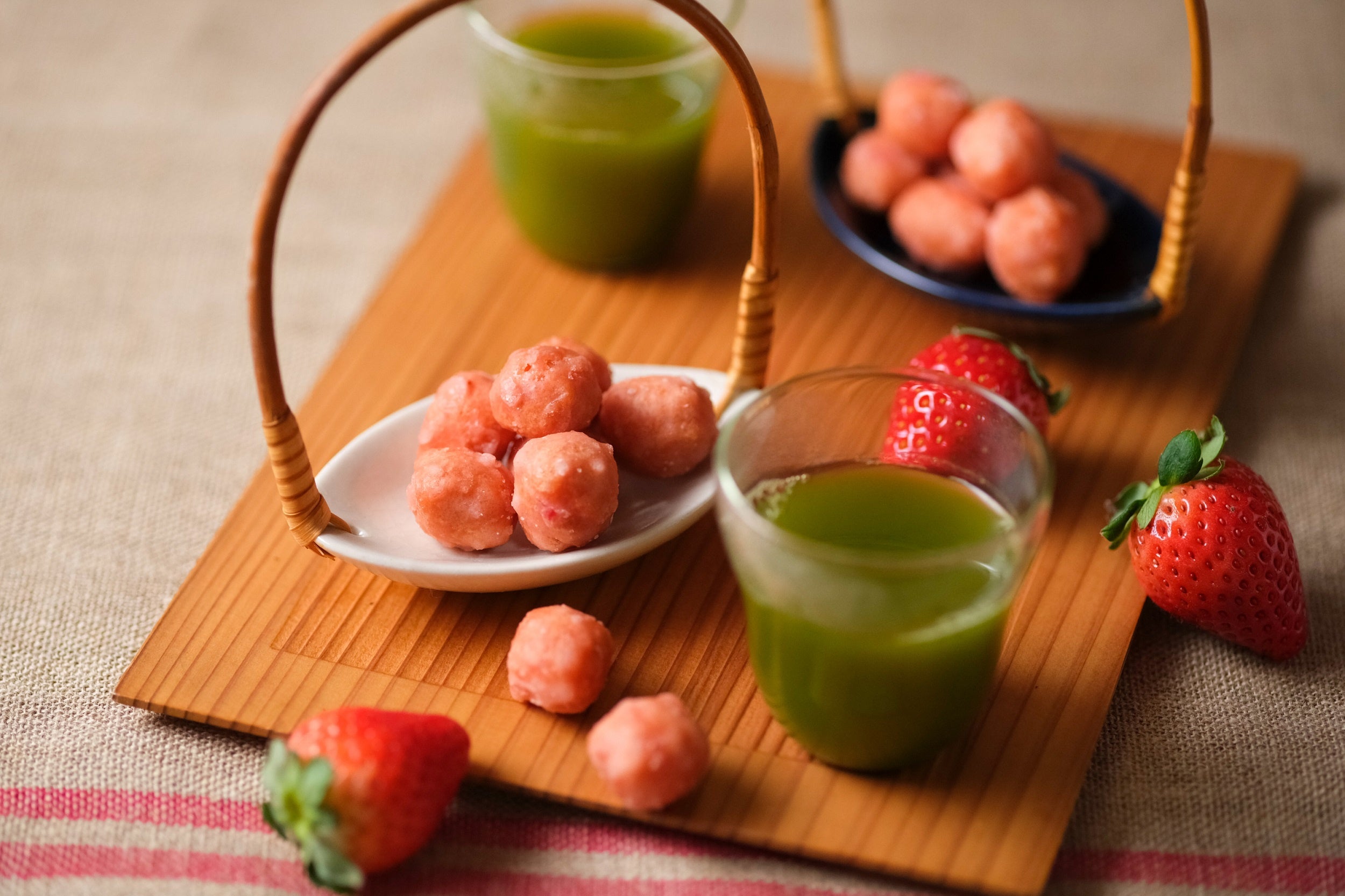 いちごの風味がかりんとうのおいしさに調和するベストなバランスを求めて試行錯誤。生地には、カリっとした食感と小麦粉の香りを引き立たせるため2種類の小麦粉をブレンドして使用し、米油の温度を少しずつ下げながら3度揚げしています。まろやかな緑茶に合うのはもちろんのこと、烏龍茶・ジャスミン茶などの温かい中国茶と合わせるのもおすすめです。