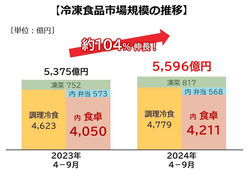 2024年上期の冷凍食品市場規模は5,596億円で、前年同期比で約104%と伸長しており、冷凍食品市場規模は年々拡大しています。特に市場の約75%を占める食卓品は前年同期より161億円拡大し、市場を牽引しています※。
