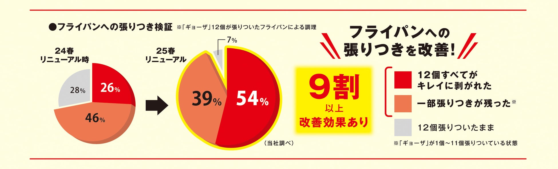生活者の「フライパンにギョーザが張りついてしまう」という声に対し、2024年2月に<ギョーザ>のフライパンへの張りつきを改善するリニューアルを実施しました。さらにこの春、当社独自技術の「羽根の素」のさらなる改良の結果、より張りつきにくくなり、誰でもパリッとした羽根つき餃子が焼けるようになりました。「12個完全に張りついてしまうフライパン」で調理検証したところ、その内の9割以上のフライパンで<ギョーザ>の張りつき改善効果が確認できました。