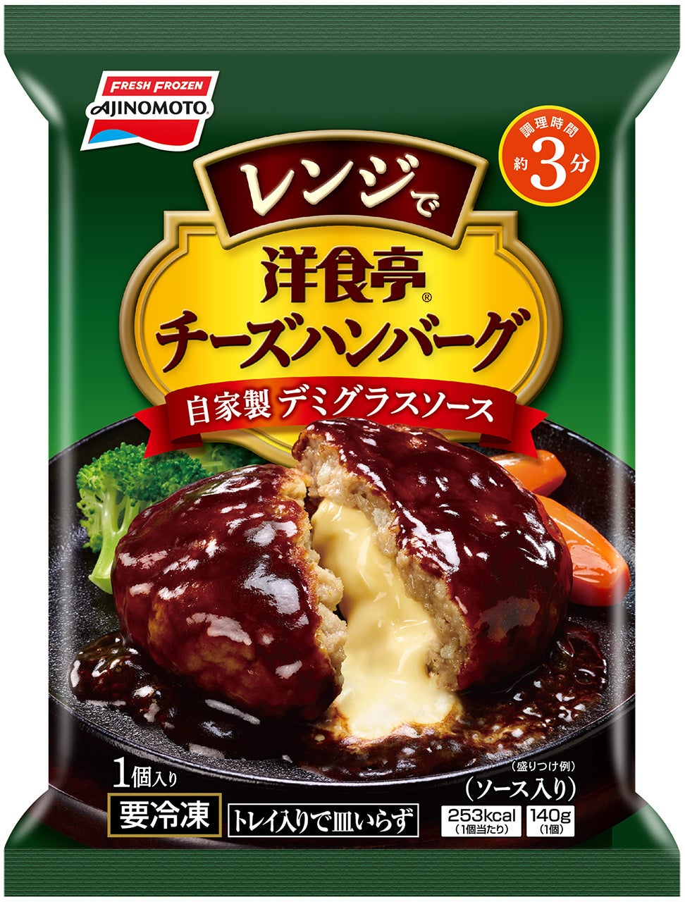 今回発売する「洋食亭®」<レンジでチーズハンバーグ 自家製デミグラスソース>は、食べたいときにトレイのまま電子レンジで約3分(600W)調理するだけで、簡単に1人前のチーズハンバーグができあがります。1997年の発売以来、本格的な味わいに定評のある「洋食亭®」ハンバーグと同じこだわりの製法を採用しています。ハンバーグは鉄板で直火焼きした後オーブンでじっくり火を入れ、ふっくらジューシーに焼き上げました。さらに、自家製デミグラスソースは直火窯で小麦粉からじっくり丁寧に炒めたブラウンソースをベースにコク深く仕上げています。