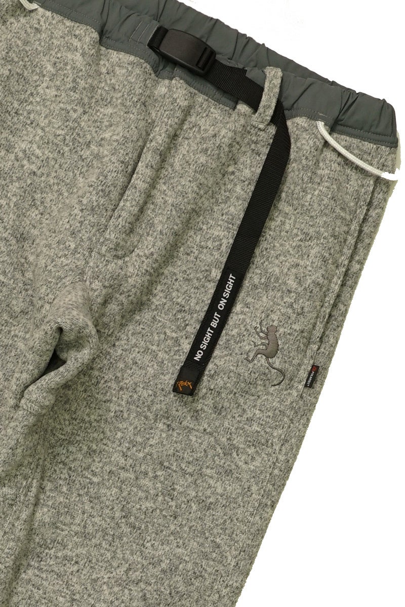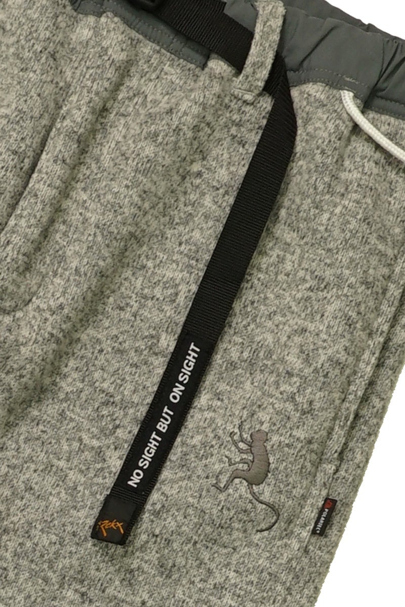 フロントジップは上下から開閉可能なWジップを採用し、やや股下深めに配置。クライミングハーネスやバックパックのウェストベルトを外さなくても下側から操作できます。脱ぎ履きしやすいように、ウエストの両サイドに縫い付けられた丸紐ループは、カラビナやキーホルダーなどを取り付ける用途としても利用できます。左太もも部分にはモンキーマジックロゴを刺繍、バックポケットにはROKXとモンキーマジックの両ロゴを縫い付け。ベルトにはモンキーマジックのタグライン「No Sight But On Sight! (見えなくても、一回で登り切れる!)」を印字しています。スポーティな用途としてはもちろん、ストリートでも違和感のないルックスは日常からお出かけ、アウトドアまで幅広く活躍してくれます。