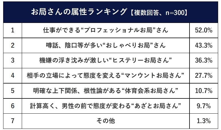 【お局さんに関する調査】お局さんの属性ランキング 仕事ができる「プロフェッショナルお局さん」52.0%。お局さんに助けられた“神エピソード”「上司から守ってくれた」