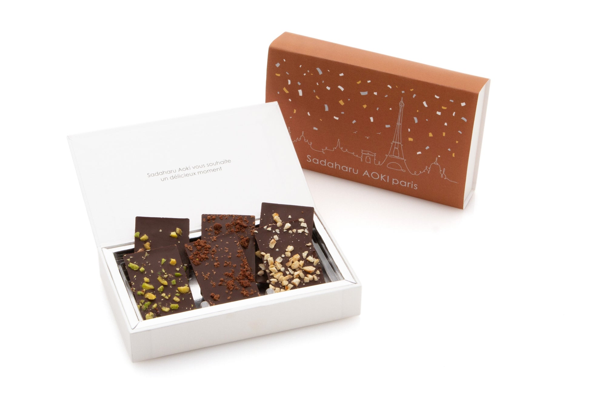 2025年はサダハルアオキ日本上陸20周年となる節目の年。バレンタインにあわせてアオキ自ら厳選したフランスやイタリアの素材、自慢のプラリネやキャラメルなどを組み合わせた魅力あふれるショコラをご用意しました。「AOKI 2025」は、ピリッと香るジンジャーがアクセントの新作「ジャンジャンブル」や、なめらかなガナッシュにオレンジの酸味とラム酒の香りが融け合う「オランジュ ラム」など、20周年を祝うアペリティフになるようなアソートをテーマに構想。鮮やかな色彩が目を引く定番のボンボンショコラや、シンプルなビターチョコレートにプラリネやキャラメルを合わせた新作ミニタブレットなど、ショコラを通じてアオキの世界観をご堪能いただけるアソートを揃えました。さまざまな素材の豊かな香りと食感が楽しめる、多彩なラインアップを本場パリからお届けいたします。