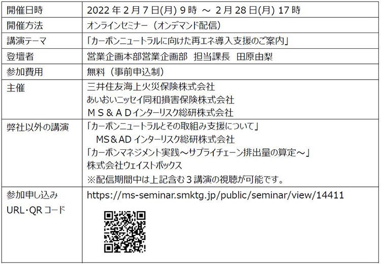株式会社エネット(本社:東京都港区、代表取締役社長:谷口 直行、以下、エネット)は、三井住友海上火災保険株式会社、あいおいニッセイ同和損害保険株式会社、MS&ADインターリスク総研株式会社が主催するオープンセミナー『カーボンニュートラルの最新動向と企業に求められる取組み』内で講演することをお知らせします。