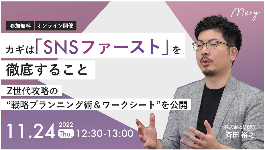 株式会社MERY(本社:東京都千代田区、代表取締役社長:藤田 欣司)は、Z世代をブランドのターゲットとしているマーケティング担当者向けのウェビナーを「カギは「SNSファースト」を徹底すること Z世代攻略の“戦略プランニング術&ワークシート”を公開」と題し、開催することをお知らせします。