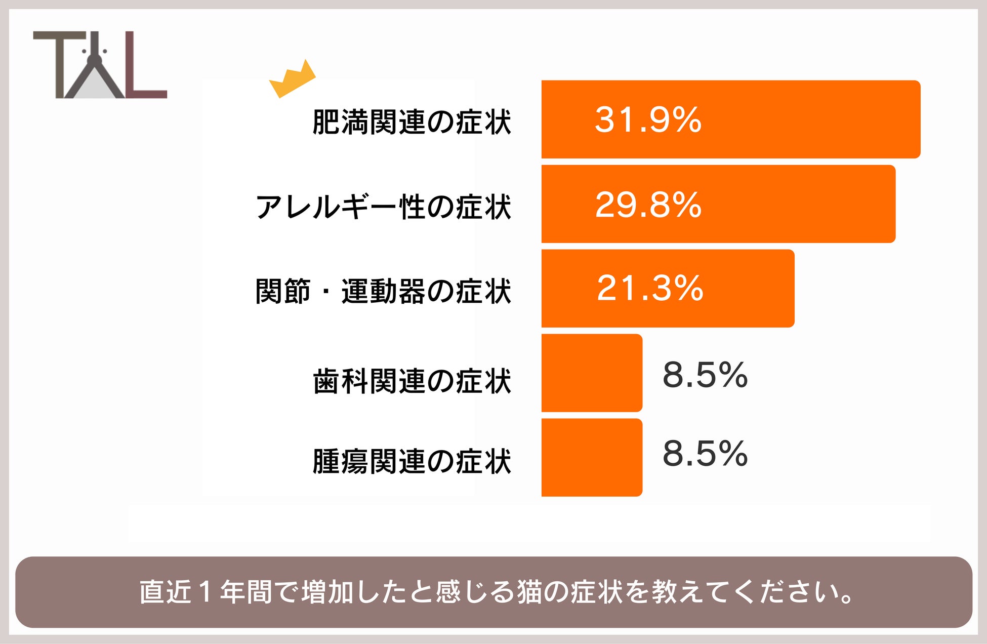 また、獣医師47名に対し「直近1年間で増加したと感じる猫の症状を1つお選びください。」と質問したところ、1位「肥満関連の症状」(31.9%)、2位「アレルギー性の症状」(29.8%)、3位「関節・運動器の症状」(21.3%)という結果となりました。