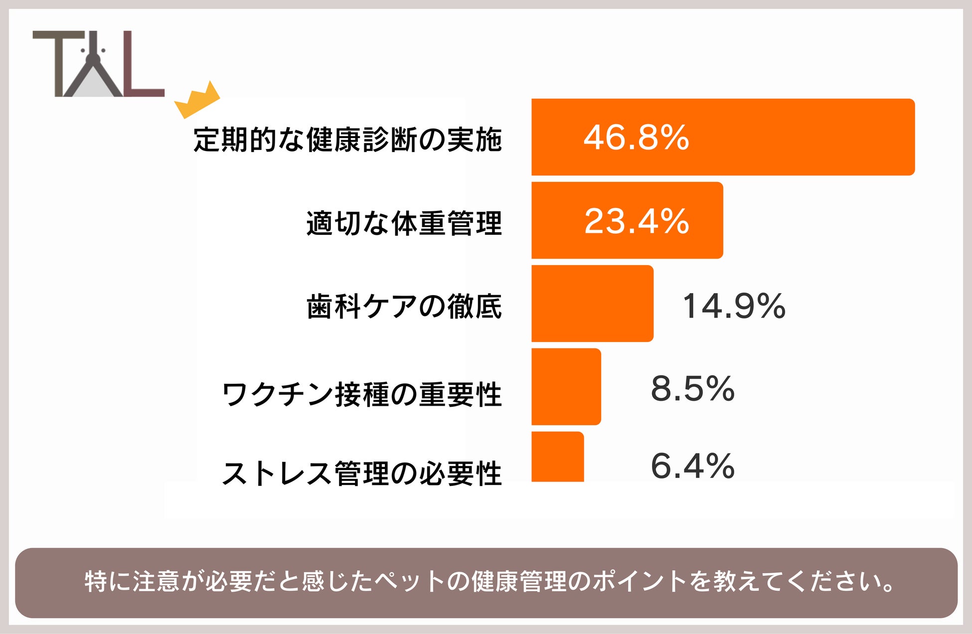 獣医師の約半数が特に注意が必要だと感じる、ペットの健康管理のポイントは「定期的な健康診断の実施」。次いで「適切な体重管理」、「歯科ケアの徹底」。
