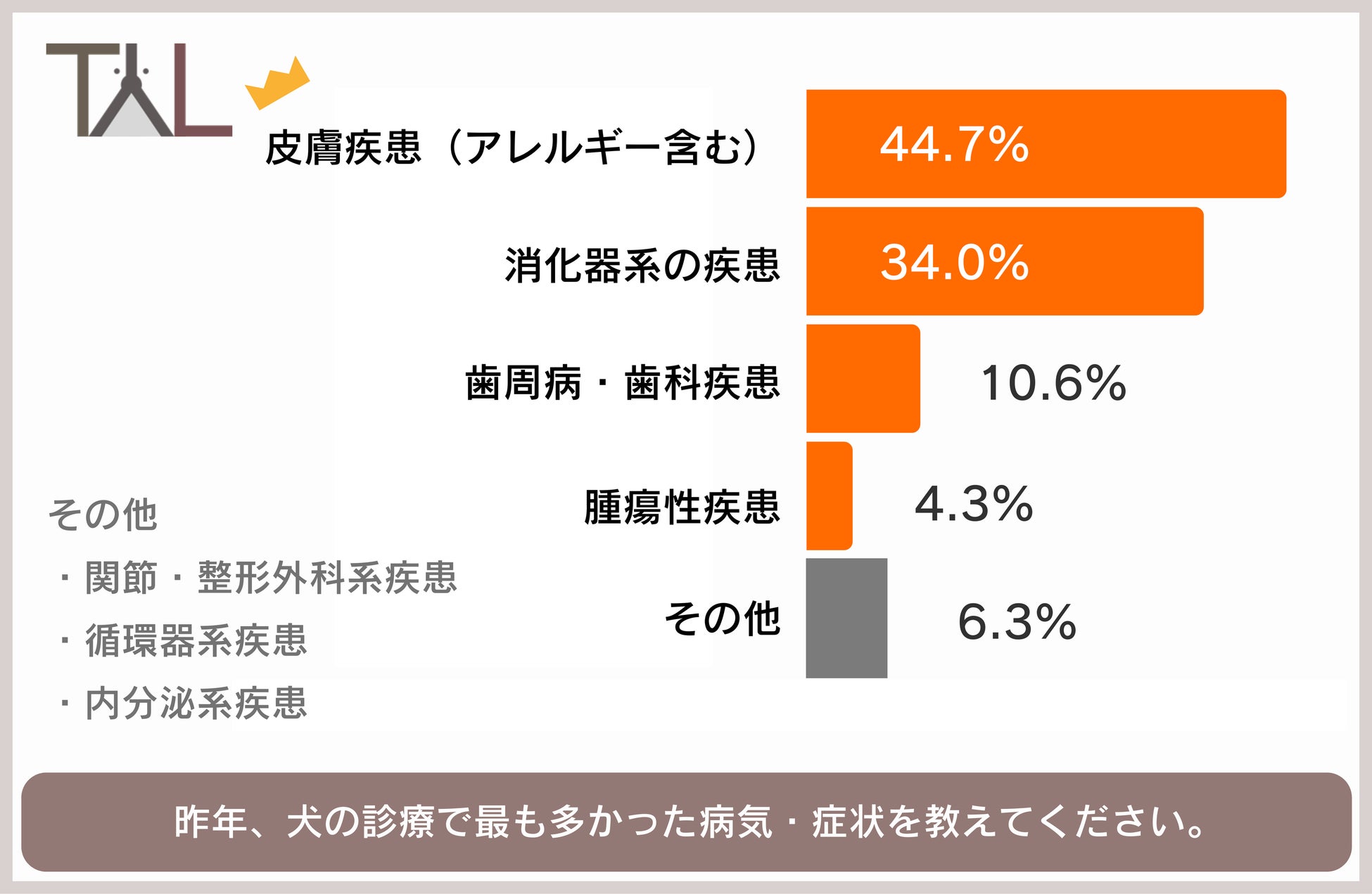 獣医師47名に対し「昨年、犬の診療で最も多かった病気・症状を1つお選びください。」と質問したところ、「皮膚疾患(アレルギー含む)」(44.7%)が最も多く、次いで「消化器系の疾患」(34.0%)、「歯周病・歯科疾患」(10.6%)という結果になりました。